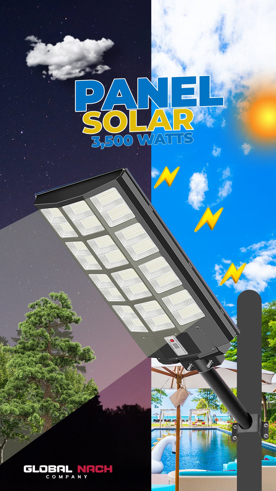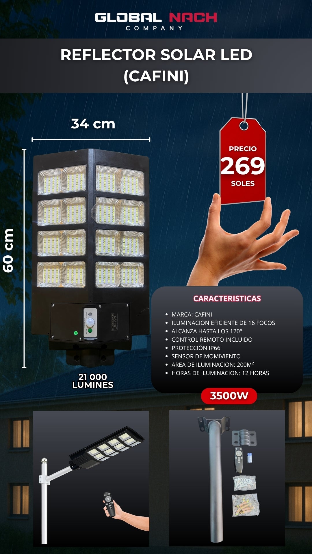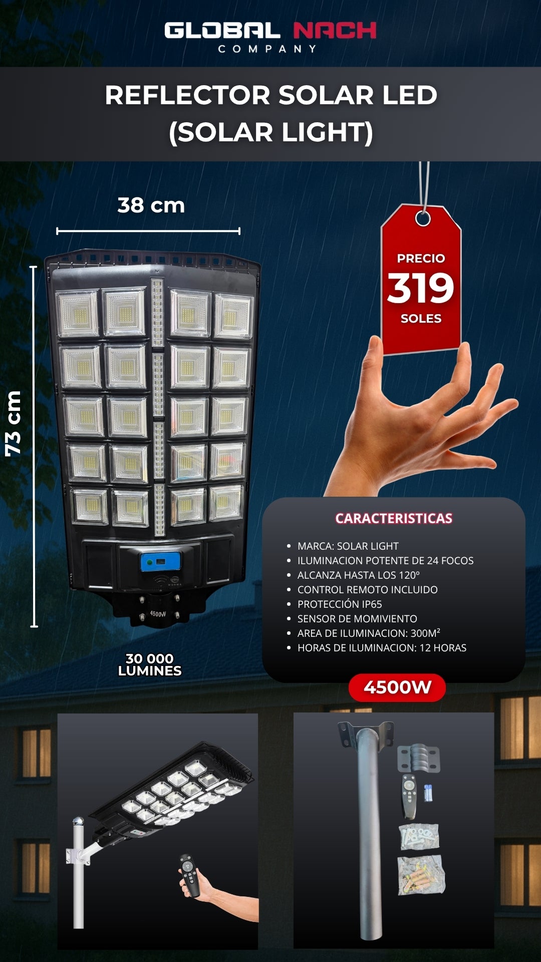 Con una potencia de 4000W y un flujo luminoso de 27000 lúmenes, este farol garantiza una iluminación intensa y amplia, eliminando por completo la oscuridad en áreas como jardines, patios, caminos, entradas y estacionamientos. Esto no solo mejora la visibilidad, sino que también aumenta la seguridad al prevenir accidentes y desalentar posibles intrusos.