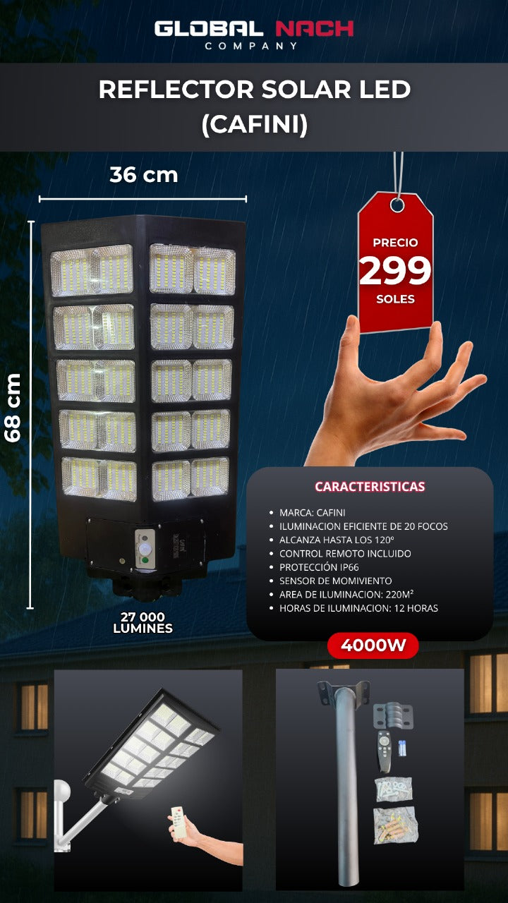 Su potencia de 4000W ilumina grandes áreas con facilidad, ideal para patios, caminos y espacios exteriores.